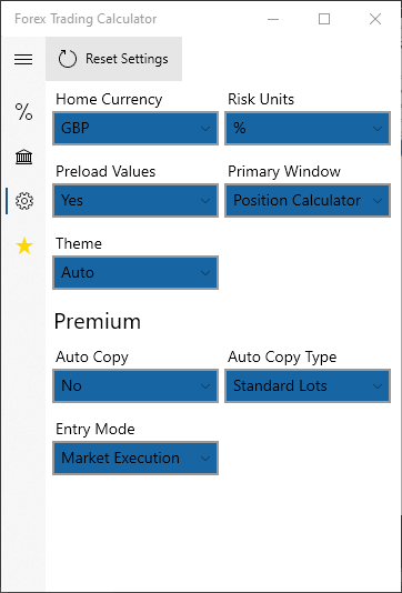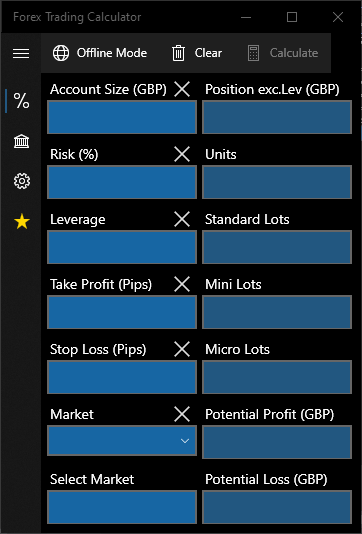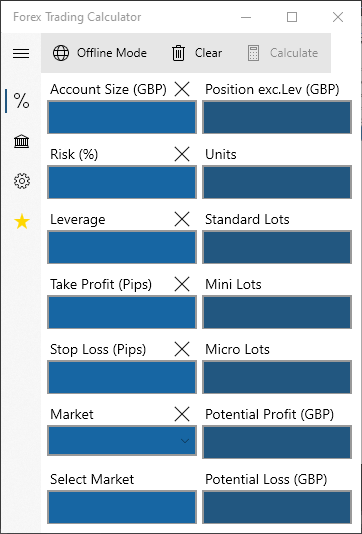 The Calculator is a free-standing PC application that lets you quickly and easily see its critical information for each currency pair you trade. Position Size Calculator Position size calculator a free Forex tool that lets you calculate the size of the position in units and lots to accurately manage your risks. The app calculates the value of pip for many currencies.